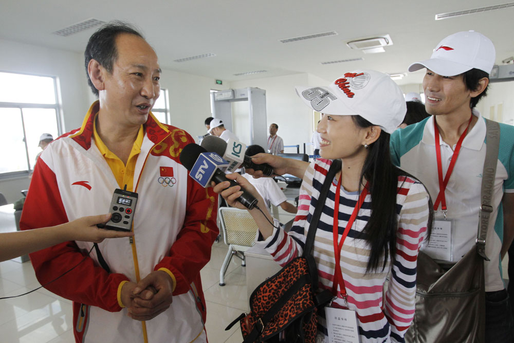 上海奧運健兒凱旋歡迎儀式在虹橋機場舉行,劉翔的教練孫海平(左)現場談起正在療傷的劉翔。他認為,劉翔手術的情況要過兩個星期才能有個說法;即使劉翔今後不再比賽,他也會從事體育工作;劉翔目前沒有女朋友。/中新社