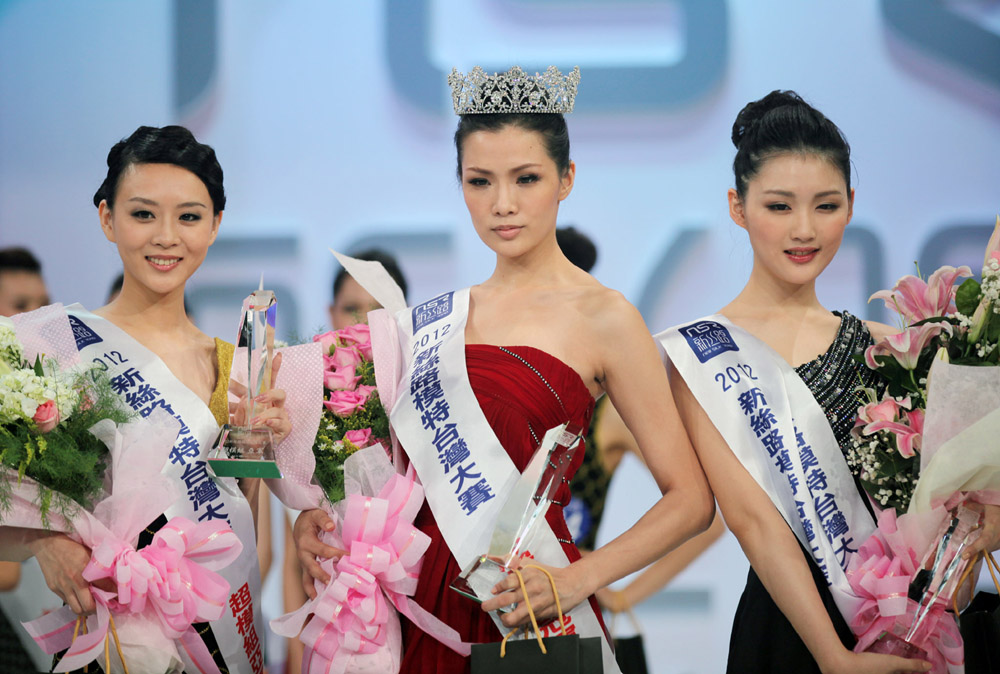 第二屆新絲路模特台灣大賽25日晚在台北舉行,共有49名男女模特參賽。圖為獲得超模組冠軍陳琪(中)、亞軍呂珮瑜(左)、季軍陳依函(右),將代表台灣於年底前往海南三亞市參加新絲路世界超模大賽,及四川成都的世界潮模大賽。 中新社