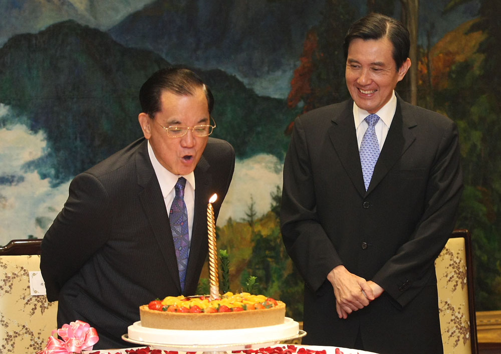 圖:馬英九(右)27日接見第20屆亞太經濟合作會議(APEC)年會經濟領袖會議代表團時,為領袖代表連戰(左)慶生/中央社