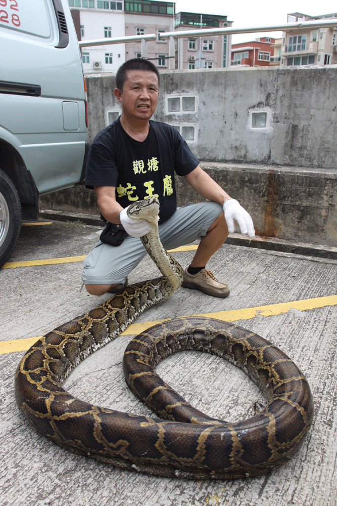 西貢蠔涌水口村昨晨近溪澗的路旁驚現一條巨蟒,姓劉蛇王到場後未幾便將其生擒,他說今次活捉的蟒蛇屬雌性,長約五米,重約一百斤,蛇身有如電燈柱般粗。此外,香港仔、八鄉及清水灣昨日亦分別發現蛇蹤,幸無人被咬傷。