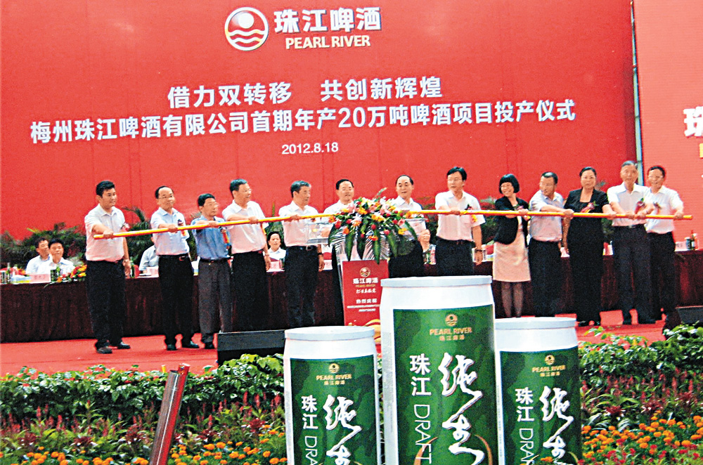 在珠江啤酒上市兩周年之際,珠江啤酒投資2.8億元,產能20萬噸的梅州項目正式投產,標誌着珠江啤酒拉開「東拓」華東市場帷幕。據了解,梅州珠江啤酒有限公司是廣州、梅州兩市貫徹落實《珠江三角洲地區改革發展規劃綱要》和廣東省「雙轉移」戰略,推進穗梅聯手共建廣州(梅州)產業轉移工業園的重大項目之一。珠江啤酒根據企業發展需要,將原年產能2.5萬噸的梅州珠江啤酒分裝公司實施易地改造,落戶廣東梅州高新技術產業園╱廣州(梅州)產業轉移工業園,成立梅州珠江啤酒有限公司。