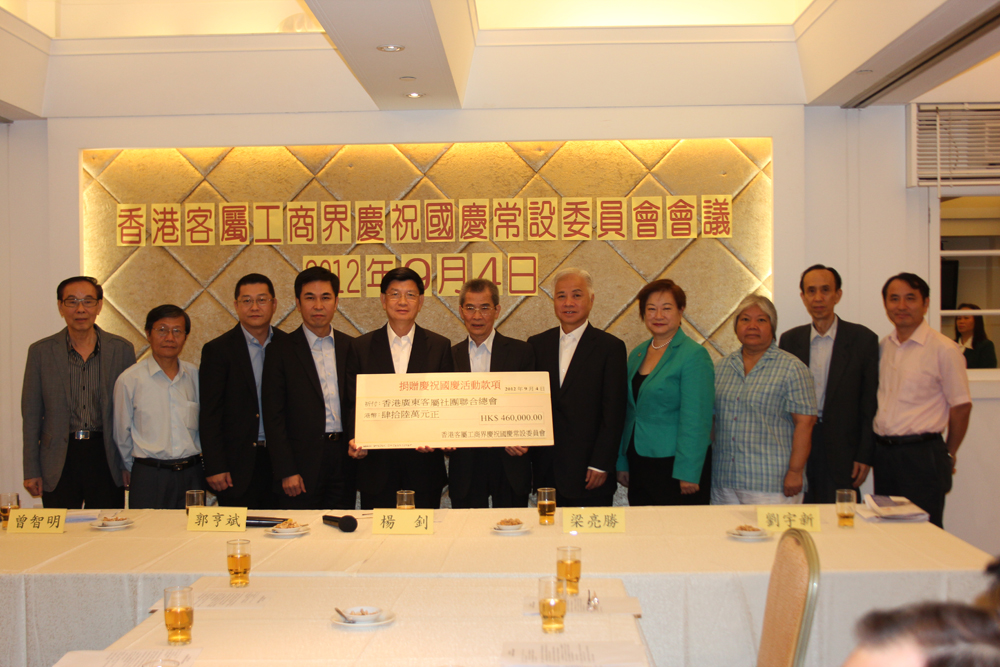 出席活動的還包括常設委員會的七個主辦團體:嘉應商會、惠州社團聯合總會、河源社團總會、梅州聯會、新界總商會、崇正總會、世界客屬總商會的首長和代表,大家表決通過把歷年舉辦國慶活動的結餘款項捐贈予客屬總會。