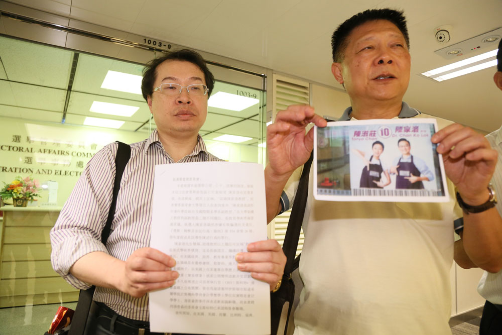 圖:民主黨成員日前到選舉管理委員會投訴陳家洛(圓圖)虛報教授職銜