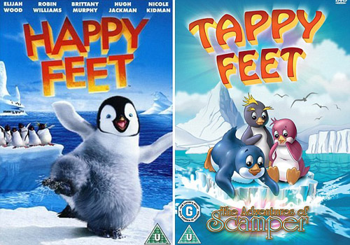 圖:迪士尼動畫片《踢踏小企鵝》及其山寨片Tappy Feet的DVD封面對比\互聯網
