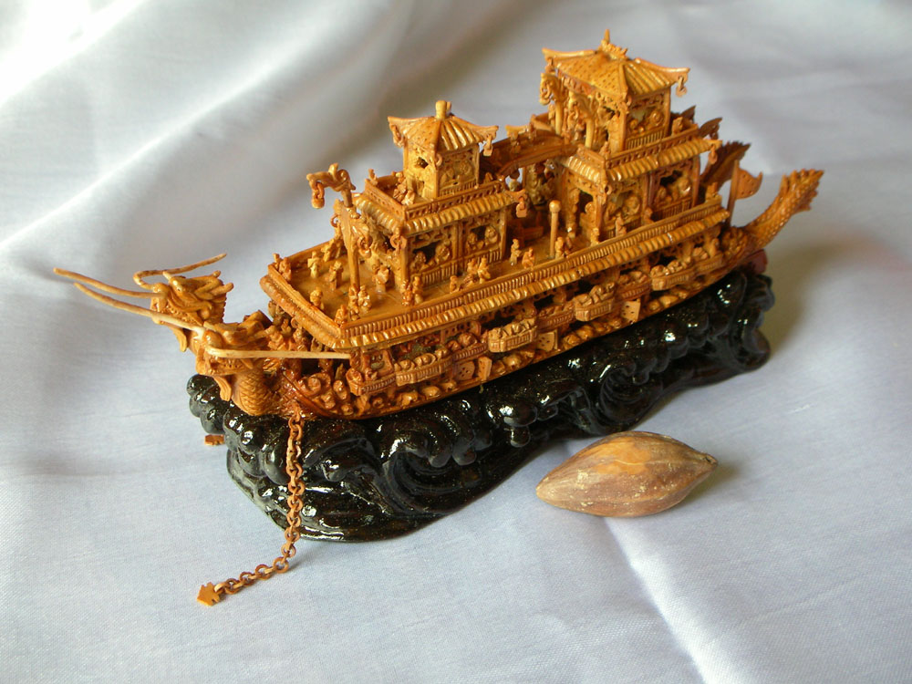 圖:曾昭鴻《中華世紀龍船》花四年時間鑲篏二百粒欖雕而成,畫舫內米粒般大小的窗戶開合自如。旁為一粒完整的欖核