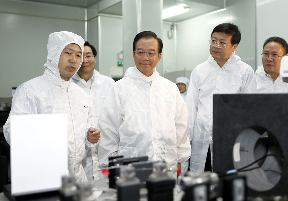 圖:在IC裝備重大專項實驗室,溫家寶聽取了集成電路最核心裝備光刻機研製和市場推廣介紹 /新華社