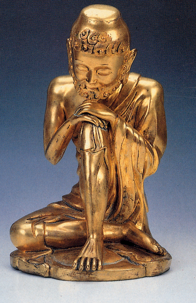 其實,清代乾隆時期精製之銅鎏金像,水準也十分高,完美者同樣「保值」,亦使人細賞悅目,百看不厭;其傳世量甚稀。例如附圖,乃乾隆時期製作之達摩禪師坐像,屈膝沉思,頗具禪味。其抹金、開金與壓光等複雜技藝,巧奪天工。乾隆以後,歷朝迄今,皆難見有仿品足以媲美。乾隆銅鎏金像雖不及北魏者古拙肅穆,與唐代者體態造型有別,也不是北齊時期那種豐圓碩健風格;但造型新穎多變,紋飾細膩精巧,線條流美別致,技藝上比北魏清風秀骨之銅鎏金三尊像不遑多讓。