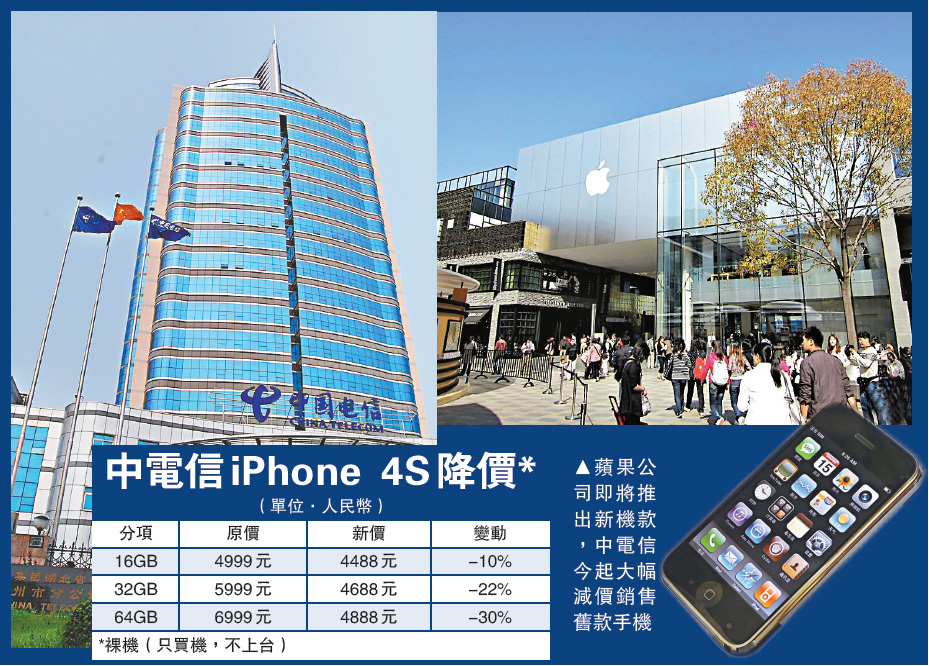 □儘管蘋果公司的iPhone 5並無驚喜,惟「果粉迷」仍然空群搶先訂購,全球首批單日預售量破紀錄達200萬部,推出不足一年的iPhone 4S即被「打入冷宮」,今年3月才正式銷售iPhone 4S的中電信(00728)急急割價「散貨」,最高降幅超過2000元(人民幣·下同),消息拖累中電信股價急跌5%,有份銷售iPhone 4S的聯通亦跌逾3%。/本報記者 李潔儀