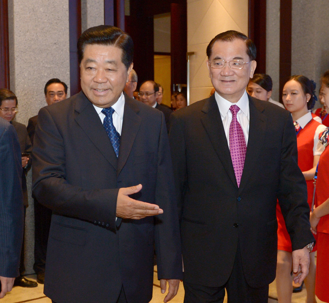圖:2012海峽兩岸企業家紫金山峰會19日在南京舉行開幕式,中共中央政治局常委、全國政協主席賈慶林與中國國民黨榮譽主席連戰攜手出席/新華社