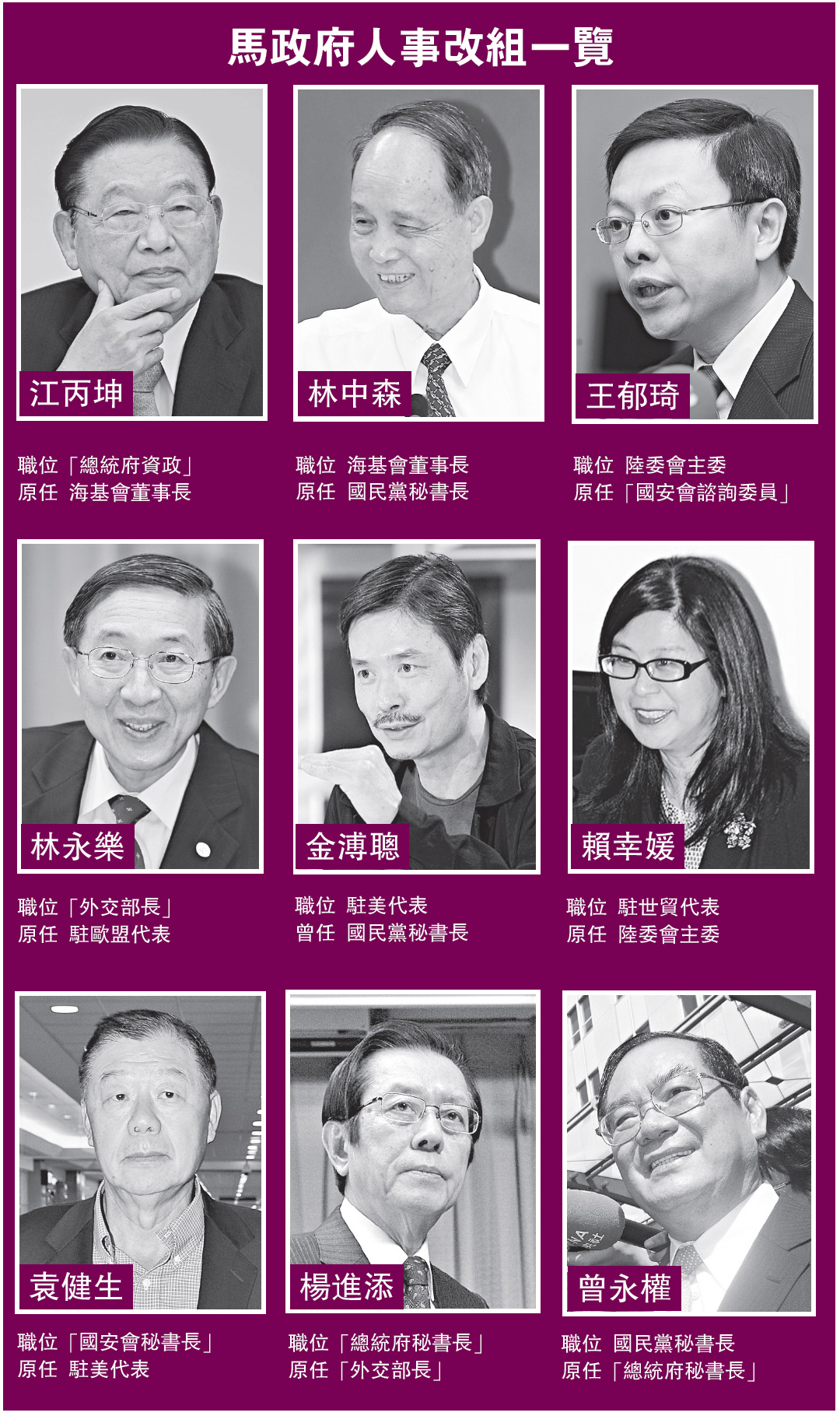 □台灣府院黨人事19日出現「大風吹」式的變動,除海陸兩會易主外,外事、安全部門也換上新面孔。海基會董事長江丙坤19日請辭,國民黨秘書長林中森將接海基會。陸委會主委賴幸媛將轉任台北駐世貿代表,馬核心幕僚、「國安會」諮詢委員王郁琦接掌陸委會。台灣輿論認為,這次人事變動,將可更加貫徹馬英九的兩岸及外事政策。