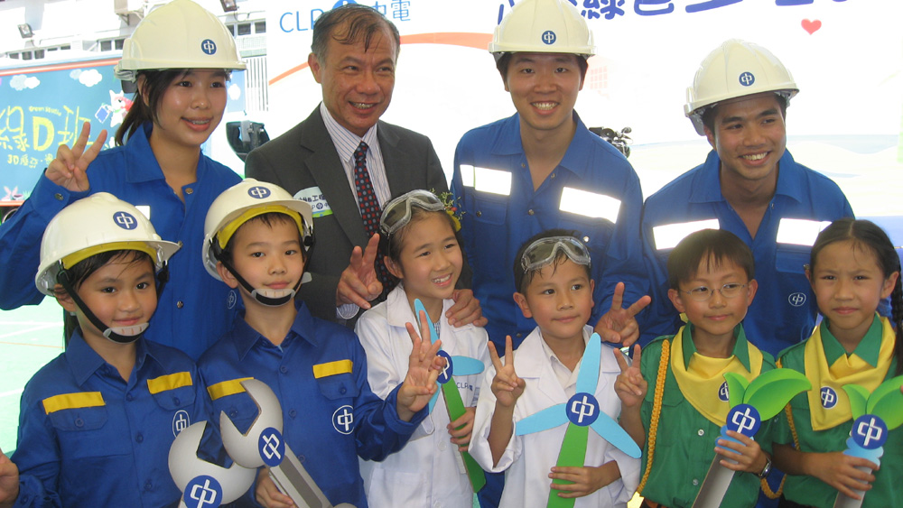 中電市場及客戶服務部總監周立文(後左二)、中電工程師陳偉雄(後右一)、李昊沺(後右二)、嚴德娟(後左一)與沙田圍呂明才小學學生代表出席「小小綠色工程師計劃」啟動禮。