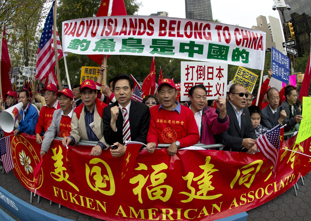 當天上午,在抗議活動現場,近千名抗議者在「紐約各界華僑華人保衛釣魚島聯合行動委員會」聯絡人朱立創等僑團領袖的帶領下,手持五星紅旗和中英文「日本滾出釣魚島」、「中國神聖領土不可侵犯」等標語牌,高呼口號,抗議日本將中國領土「國有化」。