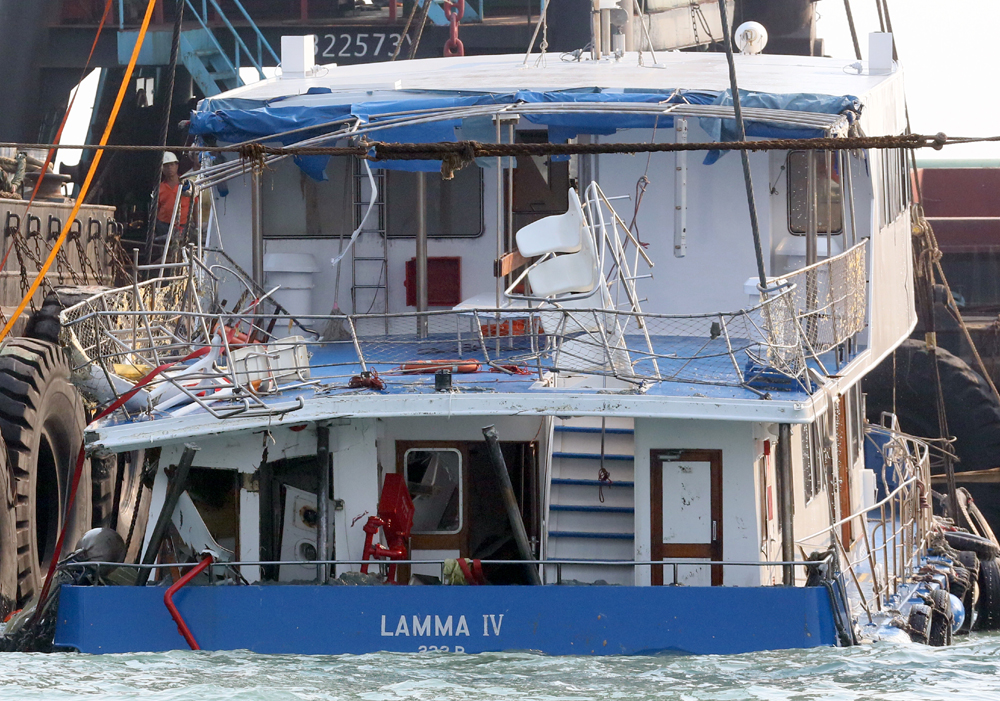 圖:南丫島沉沒的港燈船隻,已經由躉船吊上水面\本報記者麥潤田攝