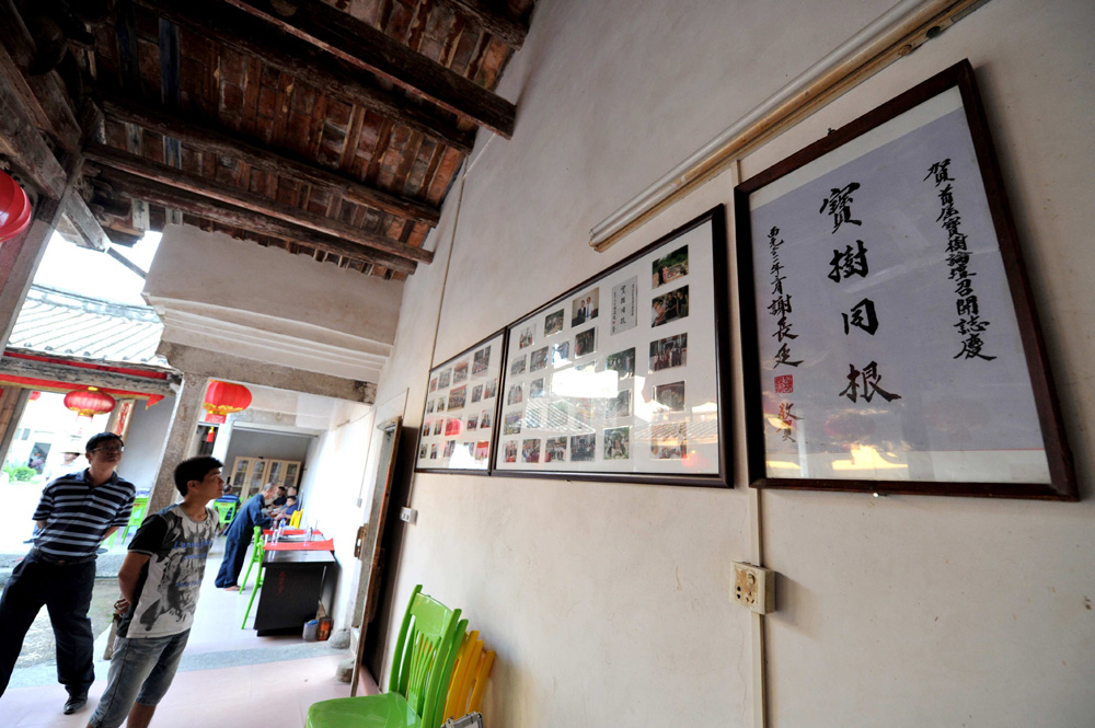 圖:在福建漳州東山縣銅缽村謝氏宗祠裡,謝長廷的題詞「寶樹同根」懸掛牆上,引人注目\中新社