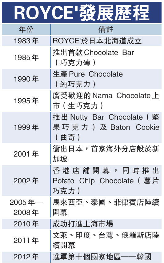 □朱古力(巧克力)早在4000年前屬於貴族食品,幾經演變,時至今日已再不是貴族專利。日本北海道朱古力品牌ROYCE',10年前踏足香港,看中港人愛吃朱古力的心態,每年營業額均有逾10%增幅,集團太子女山崎末央子(Maiko Yamazaki)表示,內地市場肯定極具發展潛力,未來亦繼續在本港尋找合適的開店機會,期望銷售額平穩增長。\本報記者 李潔儀