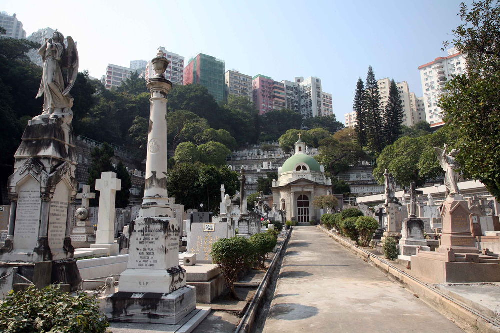 天主教聖彌額爾墳場於一八四八年建成,在中軸線兩旁的墓碑大多是年代久遠的外籍人士。早年在港的天主教徒主要來自葡萄牙、愛爾蘭、法國和意大利,有政府官員、商人、軍人、外國使節、傳教士和修女等,墓碑設計較為多樣化。這些塑像帶有歐陸色彩,料出自外籍工匠之手。徜徉其中,如置身於西方墓園中。