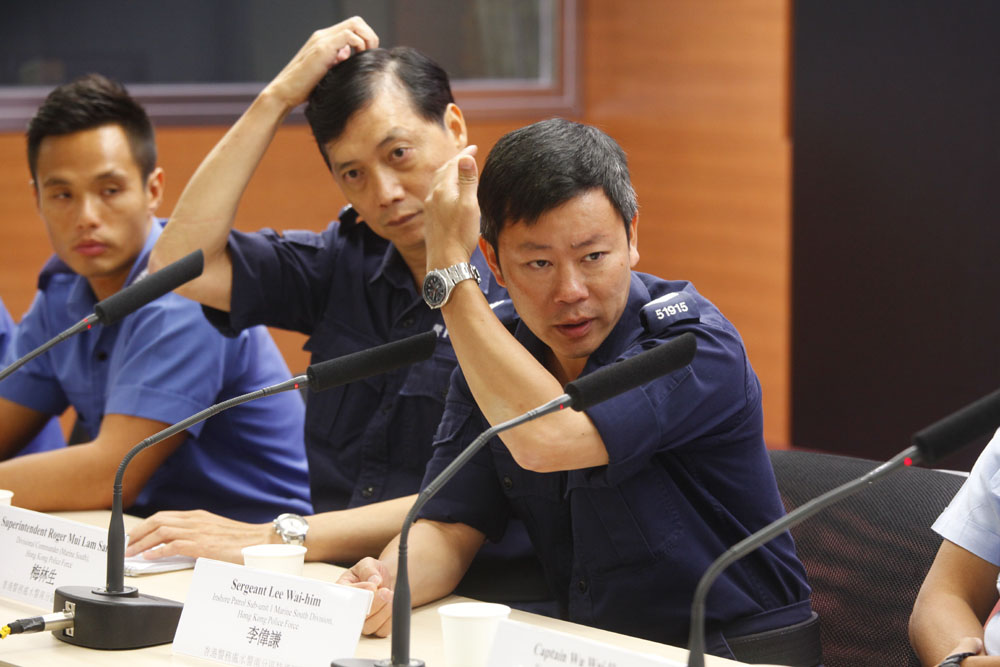 圖:水警南分區特遣隊警長李偉謙(右)在記者會憶述搜救過程本報記者杜漢生攝