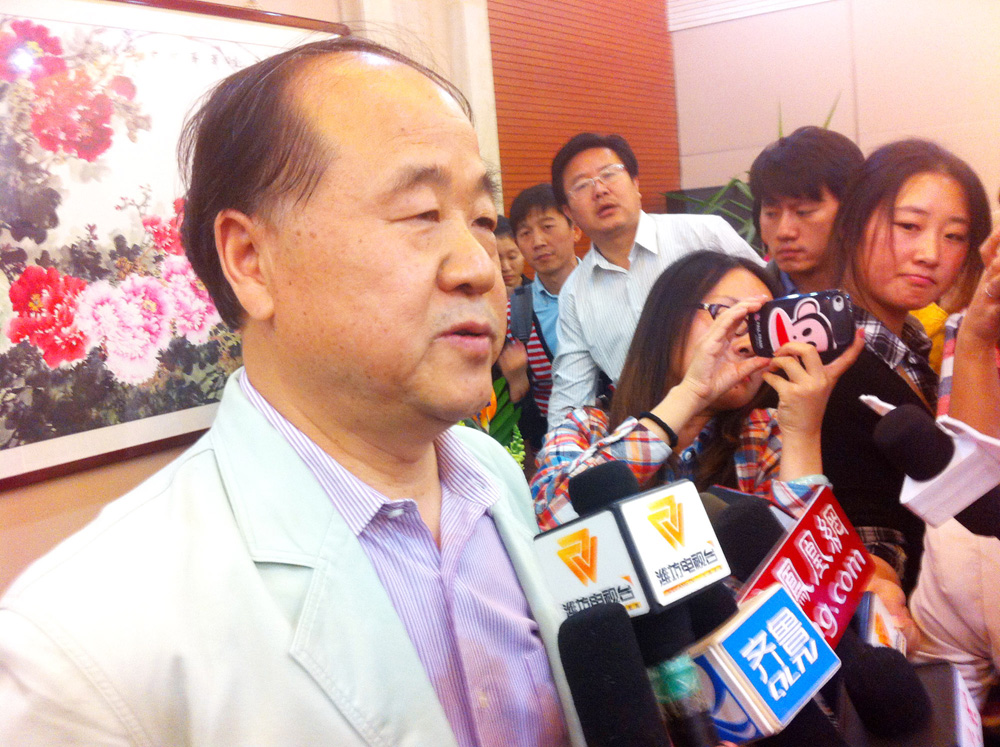 圖:剛剛獲得諾貝爾文學獎的中國作家莫言,11日在自己家鄉山東高密接受中外記者採訪/中新社