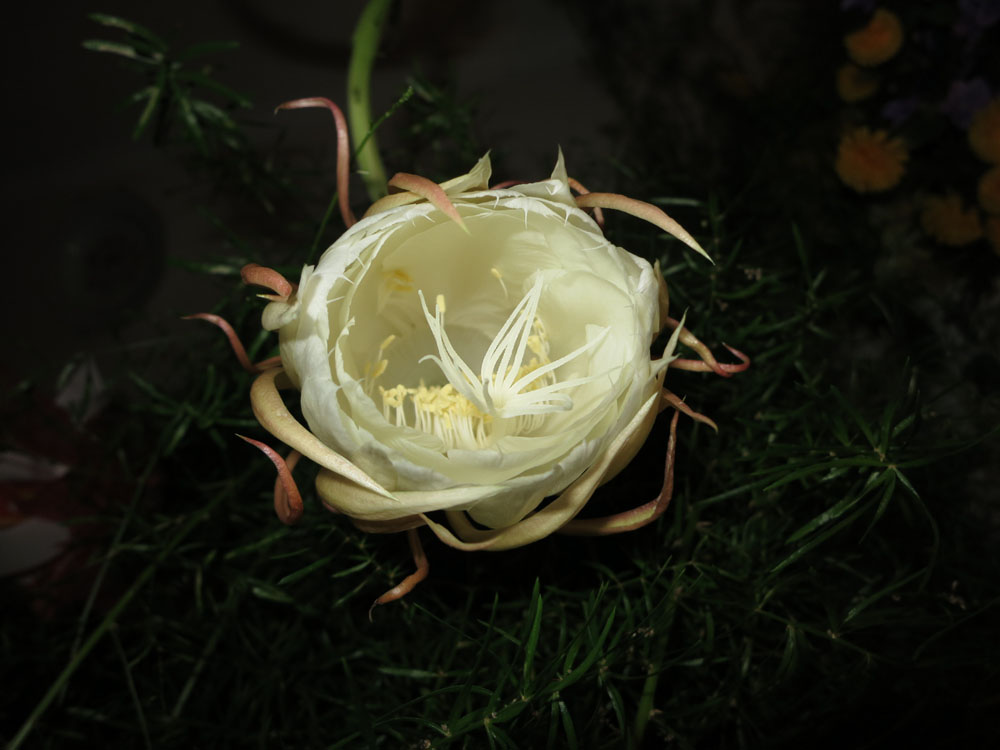 原來曇花原產於南非、墨西哥,屬於熱帶沙漠裡旱生性植物,為了要在乾旱炎熱的環境下生存,不得不改變身體結構及生活習性,長年進化演變下,乃成特性,注定仙蹤。曇花嬌嫩,那堪沙漠暴曬,晚上開花,不待天明,便已告別,只為避開烈日,以及減低水份蒸發。曇花屬蟲媒花,昆蟲在沙漠活動最頻繁的時段在入夜之後,夜半之前,因入夜前沙漠仍熱,半夜時沙漠太冷,必須趁此開花。曇花渾體皎白如月,是要讓昆蟲於黑暗中易於發覺吧;而香氣濃烈,正是為了吸引昆蟲前來授粉了。開花期那麼短促,怎能不施展渾身解數?極盡妍麗,迸盡香氣,都只為了在最理想的時機授粉。