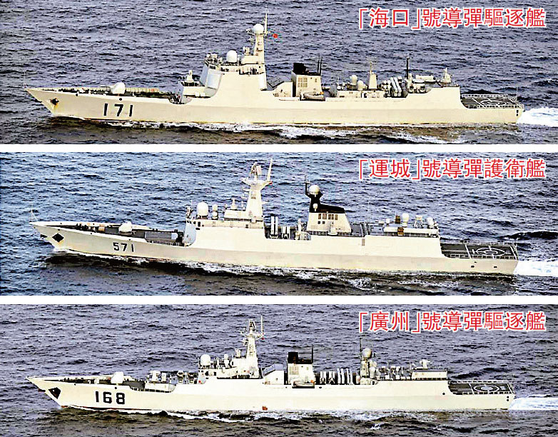 日方巡邏機觀測到的3艘中國海軍艦艇分別為:有「中華神盾」之稱的052C型171「海口」號導彈驅逐艦、054A型571「運城」號導彈護衛艦、52B型「廣州」號導彈驅逐艦。