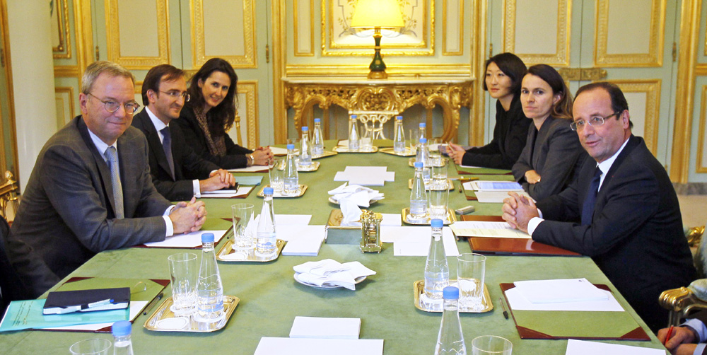 圖:法國總統奧朗德(右一)29日會見谷歌執行董事長施密特(左一)/美聯社