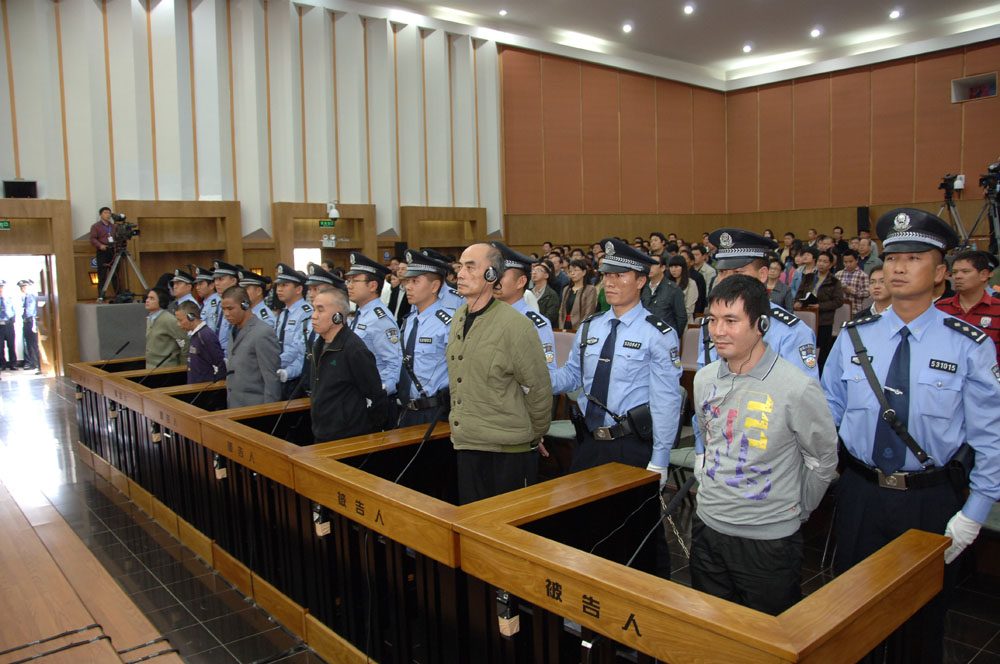 圖:6日,湄公河中國船員遇害案主犯糯康、桑康·乍薩、依萊、扎西卡、扎波、扎拖波在接受宣判 中新社