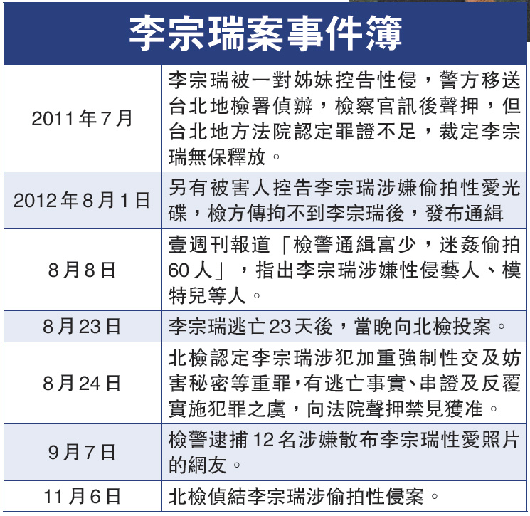 8月1日,台北地檢署正式發布通緝令,李宗瑞在逃亡藏匿23天後,終於8月23日晚間投案。檢方當晚進行偵訊後隨即申請羈押獲准。在羈押的2個多月內,檢方逐一清查,認定最少有32名被害人,但能確認身份的只有18人,其中有17人對李宗瑞提出告訴。檢方偵辦期間,還意外查出李宗瑞有不少偷拍光碟,受害女子多達數十人,當中不乏遭下藥迷姦。