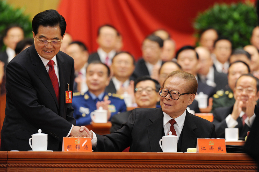 圖:胡錦濤作完報告後,江澤民與胡錦濤親切握手\新華社