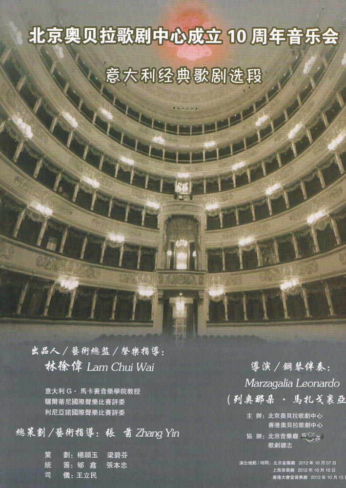 聲樂教授林徐偉主理的「北京OPERA歌劇中心」十周年音樂會在北京、上海舉行之後,十月中移師香港演出,參演者有女高音阮余群、吳艷彧、柯綠娃,次女高音馮春霞,男高音吉日嘎拉、李爽、郇鑫、劉怡然,男中音劉揚、耿哲,男低音關致京,他們都是中國栽培出來的聲樂優才,條件好,素質佳,方法對,路子正,Bel Canto(美聲唱法)掌握得不錯,學有所成,可造之才,展現出目前中國年輕歌唱家的水準。這是一次成功演出。