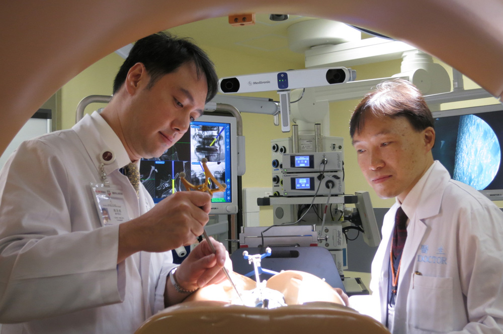 圖:陳英琪(左)表示,三維X光引導手術及電腦導航手術儀器,有助提高手術準確性及安全性,令病人更易康復。旁為東區醫院矯形及創傷外科(骨科)部門主管曾偉略