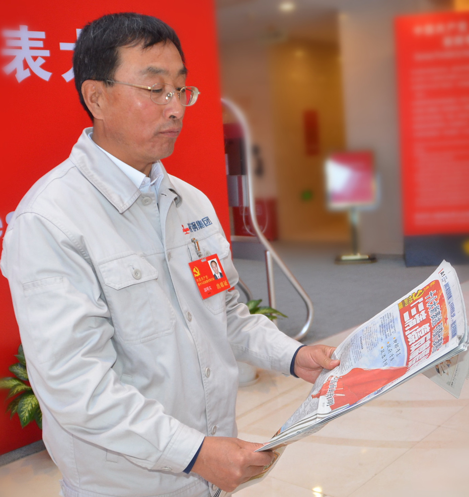 圖:十八大代表郭明義在十八大新聞中心閱讀大公報/步瀟瀟攝