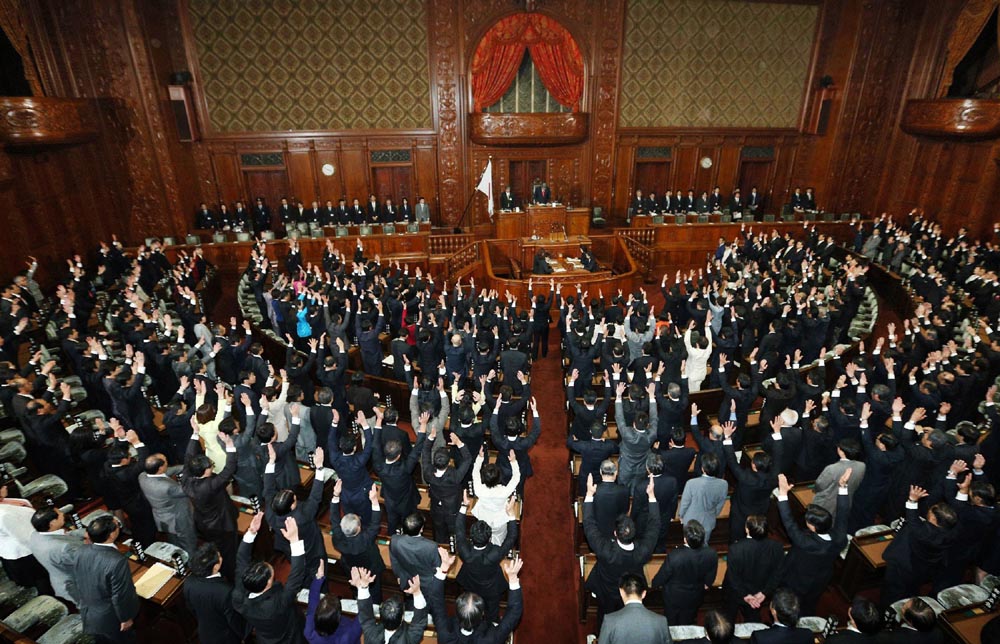 圖:日眾議院成員16日在國會議事堂歡呼/法新社