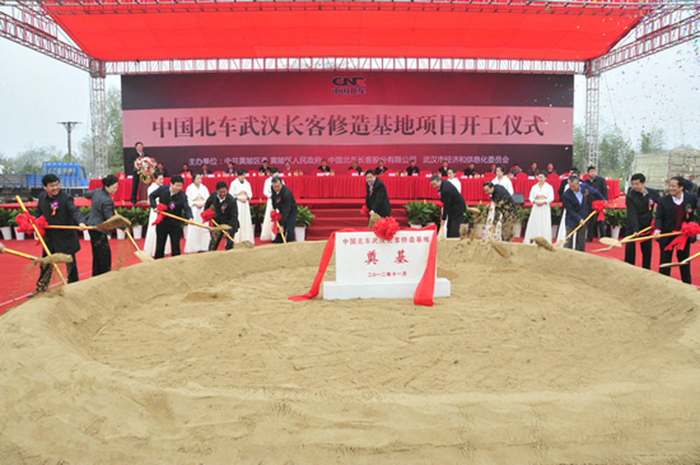 圖:中國北車長客股份公司位於武漢的軌道裝備造修基地20日開工,是為中西部同類基地中最大型。圖為工程奠基儀式\網絡圖片