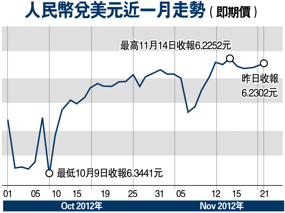 根據BIS最新數據,二○一二年一月人民幣實際有效匯率指數創下一九九四年該數據公布以來新高的109.4,而九月則創下自二○一一年十一月以來最低水準。數據還顯示,十月人民幣名義有效匯率指數為105.67,環比上升0.65%。