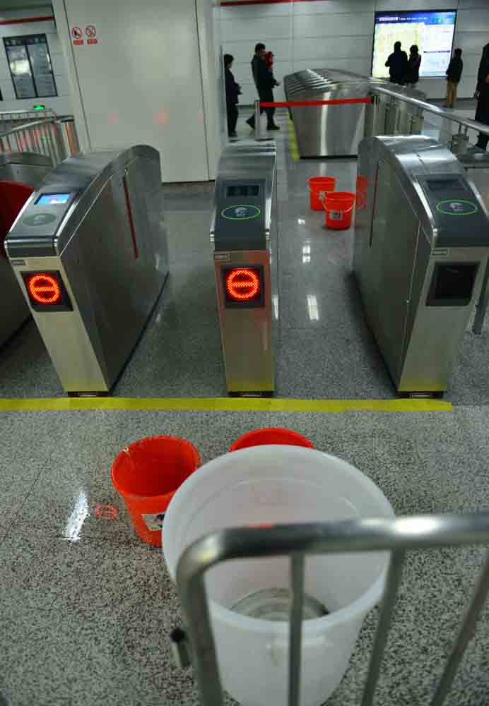 圖:杭州地鐵開通10日不到已經發生3次漏水情況。圖為杭州地鐵1號線定安路站站廳層A出入口進站閘機口邊上出現漏水情況\中新社