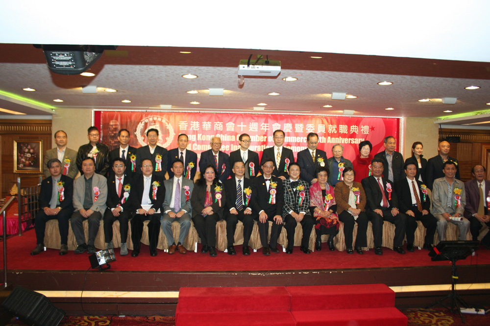 圖:香港華商會舉辦十周年會慶暨委員就職典禮,主席台上賓主合影