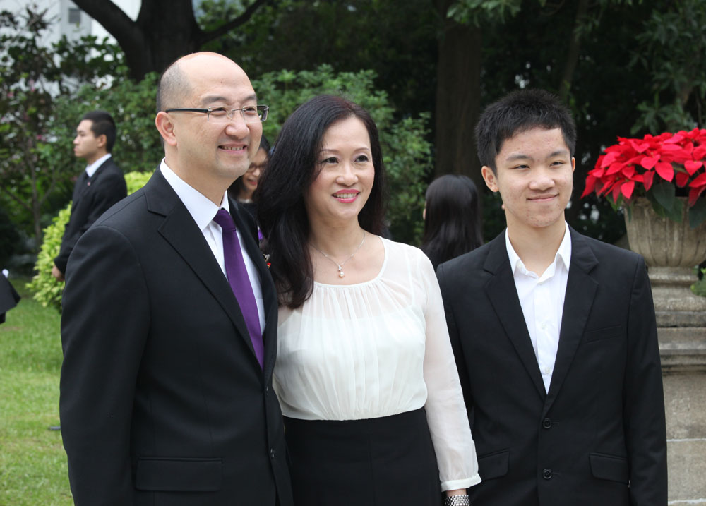 ●獲頒授金紫荊星章、服務政府逾20年的政制及內地事務局局長譚志源(圖左),昨日在太太和兒子的陪同下,出席授勳典禮。譚志源笑說,晚上會與家人吃大餐以作慶祝,並會利用聖誕假期好好休息,為稍後的工作做好準備。