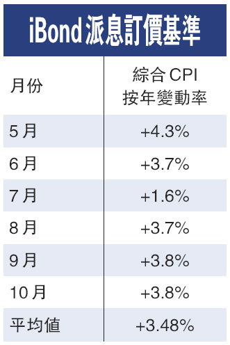 港府於今年6月發行歷來第二批iBond(通脹掛鈎債券),發行額為100億元,每半年派息一次,息率由浮息及定息組合,兩者取其最高者作為息率訂價,定息為年利率1厘,而浮息部分則取決於過去六個月的通脹表現,故即使出現連續通縮,散戶亦可收取1厘息率,而通脹持續高出1%或以上,投資者則可收取與通脹率對等的利息。