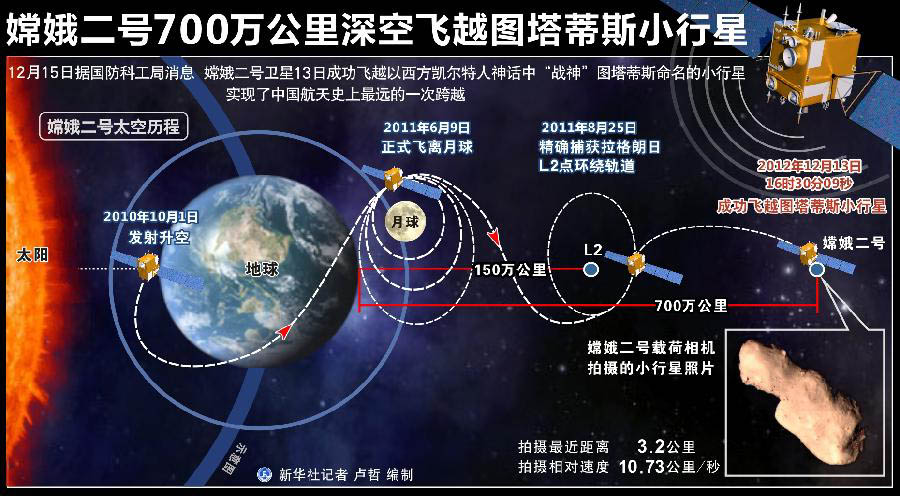 【本報訊】據中新社北京十五日消息:國家國防科技工業局介紹說,在700萬公里深空成功近距離飛越並交會探測圖塔蒂斯小行星後,嫦娥二號將繼續向更遠的深空飛行,預計明年1月初與地球距離將突破1000萬公里,實現中國航天深空探測新的跨越。