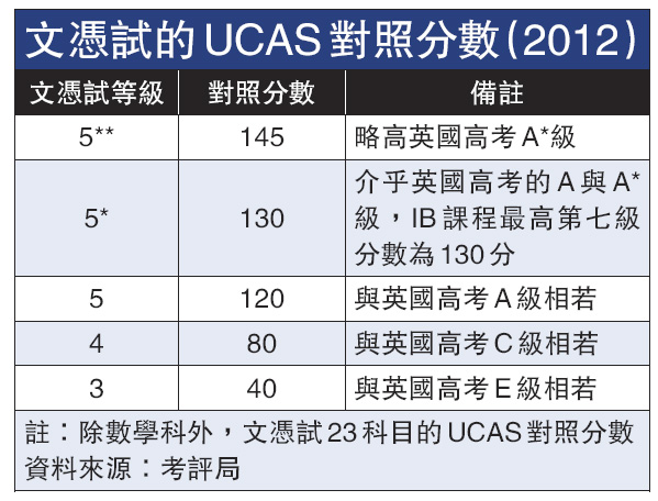 考評局於2010年宣布,文憑試獲UCAS納入分數對照制度,可與英國的普通教育文憑高級程度考試(GCE A Level,簡稱英國高考)對照,當時尚未公布文憑試最高級的5**水平對照。至於考生在文憑試奪5*級,相當於英國高考奪A與A*級之間,文憑試的3級水平與英國高考的E級(及格)相若。(見表)