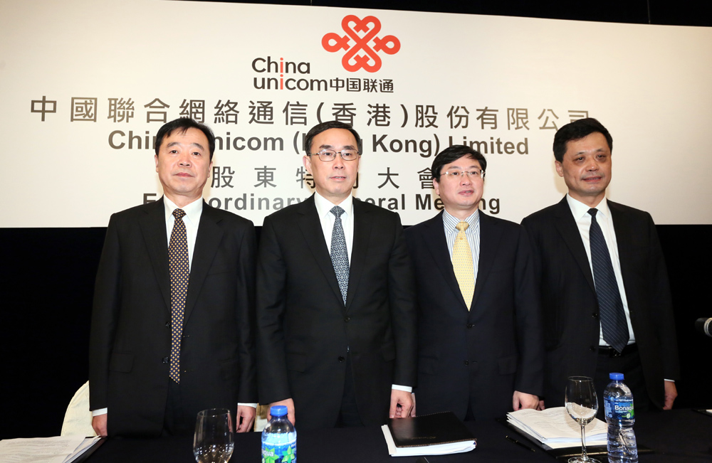 圖:左起:中國聯通執行董事兼高級副總裁佟吉祿、董事長兼首席執行官常小兵、執行董事兼總裁陸益民、執行董事兼首席財務官李福申