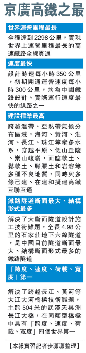 □京廣高鐵將於26日全線開通運行。22日,中外媒體率先體驗京廣高鐵北京至鄭州段的「飛速旅程」。這條全長2298公里的世界運營里程最長高速鐵路的運行,將串聯起環渤海、珠三角及多個最富經濟活力的華中腹地。多位接受鐵道部採訪的官員表示,安全是高鐵運營的第一要義,京廣高鐵即將連結廣深港高鐵,最終實現北京到香港的貫通。\【本報記者賈磊、實習記者步瀟瀟北京二十二日電】