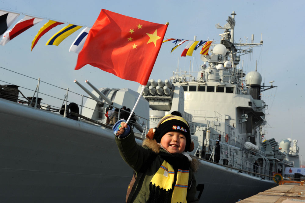 圖:一名小男孩在「青島艦」前揮舞國旗 新華社