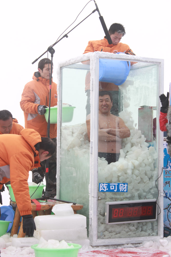今天下午1時,比賽正式開始,陳可財和金松浩兩位「耐寒奇人」脫去上衣,僅穿短褲,一前一後分別進入長80厘米、高2米的透明玻璃容器內。現場工作人員隨即倒入冰塊,直至冰塊覆蓋到他們的頸部。