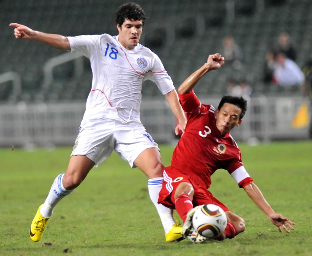 圖:潘耀焯(右)在友賽中與烏拉圭隊球員拚搶\資料圖片