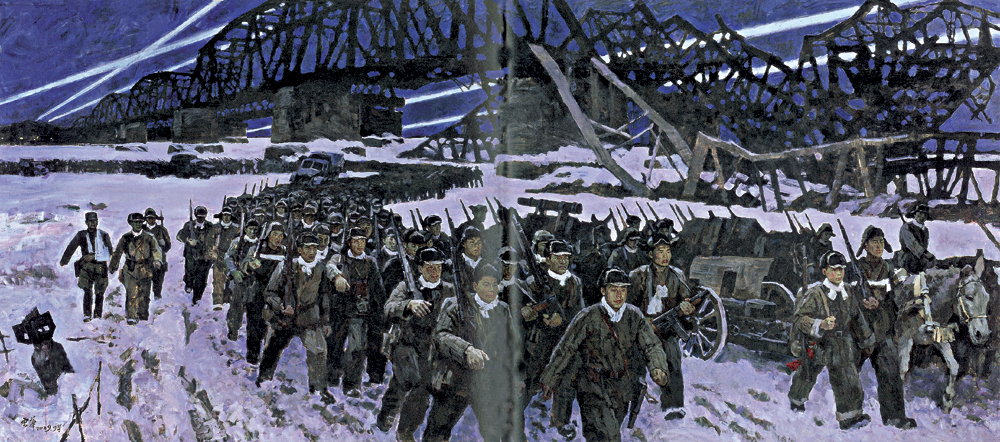 畫家選擇了「跨過鴨綠江」這一典型歷史時刻。1950年10月19日,中國人民志願軍奉命隱蔽地開過鴨綠江,完全出乎敵人意料地出現在朝鮮戰場,開始了偉大的抗美援朝戰爭。畫面以鴨綠江和江橋為背景,選取了冬夜裡隊伍過江這一特定情節,在「跨」這一動詞上做文章:畫面以冬天的雪地、被炸殘的鴨綠江大橋、黑夜、火光、探照燈為背景,塑造入朝作戰的急行軍的志願軍隊伍。為突出跨江作戰的隱蔽性和出乎意料,畫面採用了冷暖色調來表現這一歷史畫面:鴨綠江大橋橫貫畫面,在夜色籠罩、冰雪覆蓋的江面上,志願軍隊伍趁着夜色浩浩蕩蕩前行,彷彿能聽到踏雪急行的腳步聲,愈加襯托出畫面的靜寂。遠處幾束探照燈光的穿插增添了緊張、神秘氣氛,營造出隱蔽過江的意境。行軍隊伍雖然是在隱蔽中進行,但志願軍戰士們堅毅的表情和大步疾行的氣勢使畫面極具衝擊力,使保家衛國、為正義而跨江殺敵的雄偉氣勢撲面而來。畫面的局部塑造和細節描寫充實而豐富:對人物的形象特徵、身份、年齡、性格、衣帽以及槍支、背包、子彈袋等做了忠實的描繪,尤其戰士軍服上代替衣領的白毛巾並不是圍巾,而是因為戰事緊急,被服廠中部隊的冬裝都未來得及上衣領便發給了戰士。這些道具的具體表現,加上特定光線的設計與調動,突出了真實的時代感。作品真實地反映了那段重大歷史,把一幅貼近史實、謳歌正義,展現時代精神的壯美畫卷呈現在觀眾面前。通過對志願軍─這些優秀中華兒女、最可愛的人的生動形象的刻畫與塑造,來體現中國人民「抗美援朝,保家衛國」的決心和意志,彰顯中華民族熱愛和平、維護正義的氣概和精神內涵。