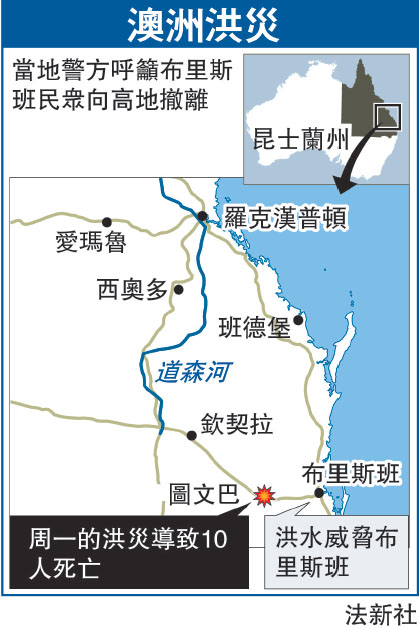 【本報訊】綜合外電報道:澳洲昆士蘭州水災災情惡化,在首府布里斯班以西的圖文巴,目前死亡人數已上升至10人,另有78人下落不明。預料洪水兩天後威脅布里斯班,當局呼籲居民向高地遷移。