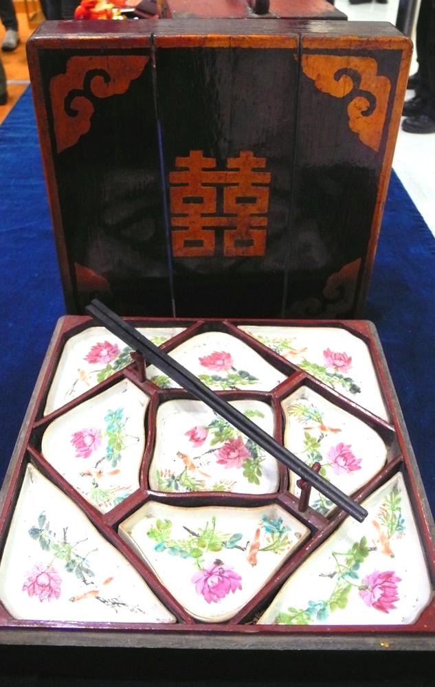 圖:民國時期「描金雙喜紋盒帶筷花卉紋攢盤」,是在婚禮時新娘的陪嫁品\本報攝