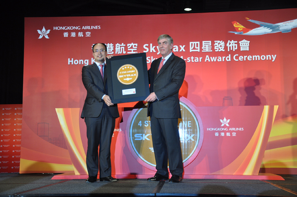 圖:香港航空總裁楊建紅(左)獲SKYTRAX機構主席Edward Plaisted頒發「四星航空公司」\本報攝
