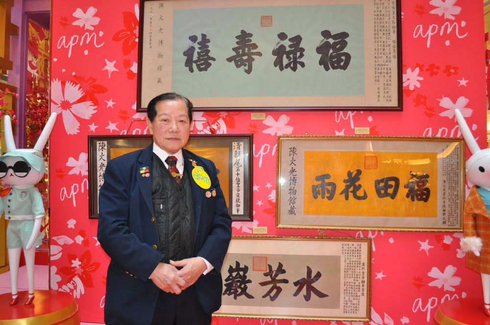 圖:陳火光與他收藏的清帝御筆書法合影本報攝